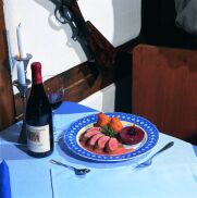 | Zubereitung: Die Sauce mit den gehackten Frischlingsknochen zubereiten und mit dem Portwein, dem Cassis-Essig und den Johannisbeeren verfeinern. Die Medaillons würzen, in Fett rosa braten und warm stellen. Den Bratenansatz mit dem Rotwein, dem Essig und dem Portwein ablöschen, reduzieren lassen und der Wildsauce beigeben. Medaillons anrichten und die Sauce an das Fleisch gießen. Beilagen: Apfel-Kartoffel-Gratin oder Pflaumenknödel und Kastaniengericht |