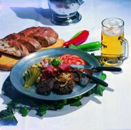 | Zubereitung: Gehacktes in eine Schüssel geben, feingewürfelten Speck zufügen. Die Kartoffeln reiben und ebenfalls zum Fleisch geben. Die fein gehackte Petersilie hinzugeben, mit Salz und Pfeffer würzen und verkneten. Mit angefeuchteten Händen Frikadellen aus dem Fleischteig formen und je zwei Speckscheiben einwickeln. Zusammen mit den geputzten Pilzen in heißem Öl 15 Minuten braten. Beilagen: Kartoffelsalat oder Weißbrot |